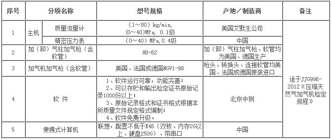 压缩天然气加气机检定装置主要技术参数